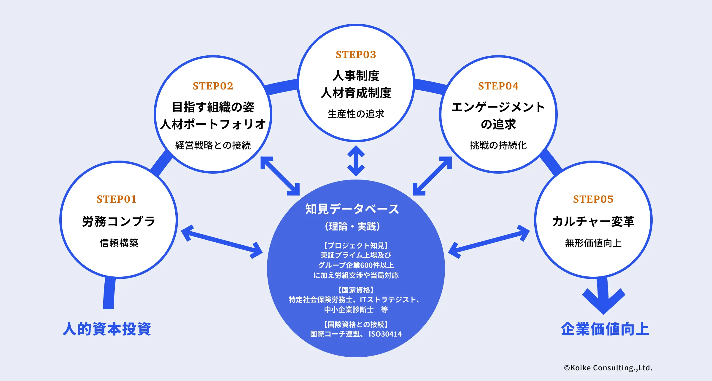 私たちは、労務コンプライアンスからカルチャー変革までの一連の進化プロセスを「5ステップ」で体系化しました。日本発の理論知と実践知を融合し、アジア全域の企業価値向上を支援します。